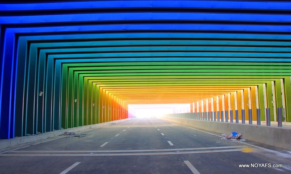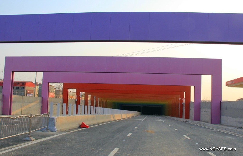 被稱為國(guó)內(nèi)首條“彩虹隧道”。位于大孟鎮(zhèn)鄭開大道與S223省道交叉口北側(cè)50米處。由信合置業(yè)投資億元修建,將原S223省道在鄭開大道交叉口處移入地下。地上變成普羅旺斯 理想國(guó)項(xiàng)目的中央廣場(chǎng)。入口處為噢特萊斯購物中心。該隧道南北兩端的引坡共安裝了80余根彩色U形箱梁,箱梁分為12種不同色彩。據(jù)介紹,駕車通過隧道時(shí),會(huì)形成“視覺漸變”的效果,美輪美奐,并在一定程度上可以緩解駕乘人員的視覺疲勞。